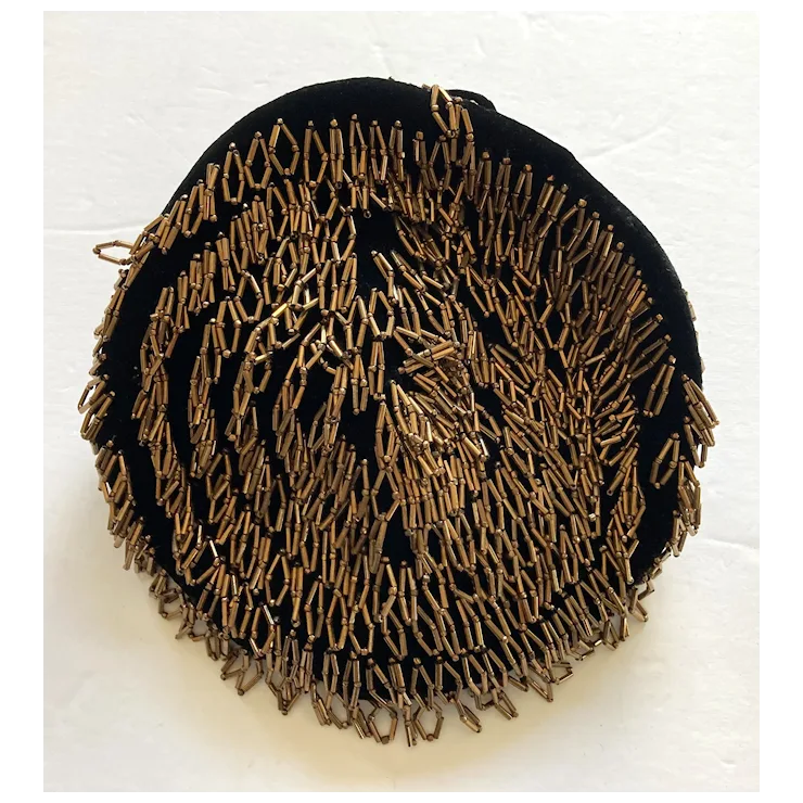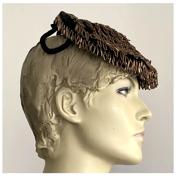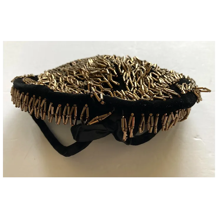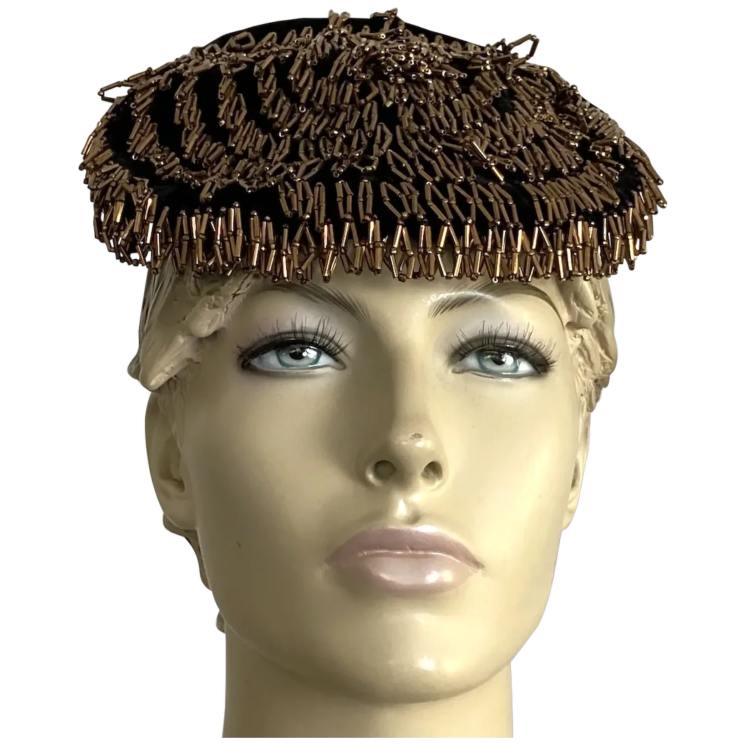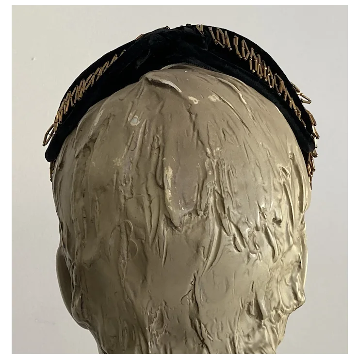 REDUCED Vintage Nat Frank Flat Black Velvet Cocktail Hat With Copper Beaded Loops